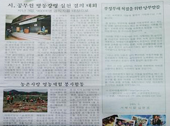 5¿ù ½ÃÁ¤¼Ò½ÄÁö¿¡ ¿ì¸®»çȸ¿¡ ±íÀÌ »Ñ¸®¹ÚÈù ºÎÁ¤ºÎÆÐ¸¦ ¹ßº»»ö¿øÇϱâ À§ÇØ °øÁ÷³»ºÎÀÇ ³ë·Â »Ó ¾Æ´Ï¶ó ½Ã¹ÎµéÀÇ µ¿ÂüÀÌ ÇÊ¿äÇϸç, °ÅÁ¦½Ã °øÁ÷ÀÚ´Â Á÷¹«¿Í °ü·Ã ¾î¶°ÇÑ ±ÝǰÀ̳ª ÇâÀÀÀ» ¼ö¼öÇÏÁö ¾Ê°Ú´Ù´Â ÀÇÁö¸¦ Àü´ÞÇÑ ¹Ù ÀÖ°í, ¿Ã ÃʺÎÅÍ °è¾àºÐ¾ß, °ÇÃàºÐ¾ß, ȯ°æ ¹× À§»ýºÐ¾ß Áöµµ´Ü¼Ó µî û·ÅµµÃøÁ¤´ë»ó ´ë¹Î¾÷¹« 4°³ ºÐ¾ß¿¡ ´ëÇÑ ¹Î¿øÀο¡°Ô ¾÷¹«¼öÇà Áß °ø¹«¿øÀÌ ºÎÁ¤ÇÑ ÇàÀ§¸¦ ¿ä±¸ ÇÒ °æ¿ì ȨÆäÀÌÁö³ª °¨»ç´ã´çºÎ¼·Î ½Å°íÇØ ÁÙ °ÍÀ» Èñ¸ÁÇÏ´Â ½ÃÀå ¼Çѹ®À» 2ȸ¿¡ °ÉÃÄ 1õ85¸í¿¡°Ô ¹ß¼ÛÇß´Ù.