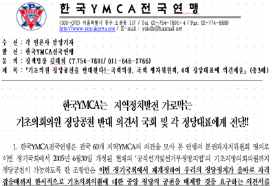 Çѱ¹YMCA Àü±¹¿¬¸ÍÀº 24ÀÏ Àü±¹ 60°³ Áö¿ªYMCA À̸§À¸·Î ±âÃÊÀÇ¿ø Á¤´ç°øÃµÀ» ¹Ý´ëÇÏ´Â Àǰ߼¸¦ ±¹È¸ ¹× °¢ Á¤´ç ´ëÇ¥¿¡°Ô Àü´ÞÇß´Ù.