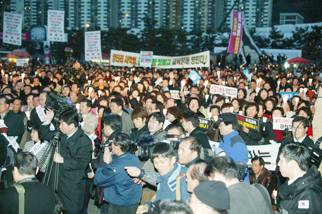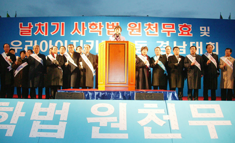 Çѳª¶ó´çÀº »çÇйý ¿øÃµ¹«È¿ ¹× ¿ì¸®¾ÆÀÌ ÁöŰ±â ¹ü±¹¹Î °æ³²´ëȸ°¡ 20ÀÏ ¿ÀÈÄ Ã¢¿ø½Ã ½Ç³»Ã¼À°°ü ¾Õ ¸¸³²ÀÇ ±¤Àå¿¡¼ ¿·È´Ù.
