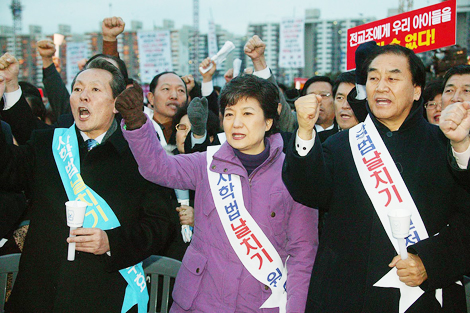 Çѳª¶ó´ç ¹Ú±ÙÇý ´ëÇ¥ÃÖ°íÀ§¿ø, ÀÌÀçÈ£ ¿ø³»´ëÇ¥, ÁÖ¿ä´çÁ÷ÀÚ, ±¹È¸ÀÇ¿ø, °æ³²µµ´çÁÖ¿ä´çÁ÷ÀÚ ¹× ´ç¿ø, °ü·Ã½Ã¹Î, Çкθð ´Üüȸ¿ø µî 5õ¿©¸íÀÌ Âü¿©ÇÑ °¡¿îµ¥ »çÇйý Àç°³Á¤À» Ã˱¸ÇÏ´Â Àå¿ÜÁýȸ¸¦ ¿°í ´ë¿© ¾Ð¹Ú°ø¼¼¸¦ À̾´Ù.