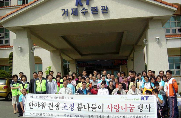 KT°ÅÁ¦ÁöÁ¡ »ç¶ûÀÇ ºÀ»ç´Ü(ÁöÁ¡Àå ³ëöÇö)Àº °¡Á¤ÀÇ ´Þ 5¿ùÀ» ¸Â¾Æ Áö³ 25ÀÏ ¹Ý¾ß¿ø(ÁßÁõÀå¾ÖÀÎ ¿ä¾ç½Ã¼³) ¿ø»ýµéÀ» KT°ÅÁ¦¼ö·Ã°üÀ¸·Î ÃÊû, ¼ö·Ã°ü ½Ã¼³ °ßÇаú Àå¾ÖÀÎ ¸ñ¿åºÀ»çÀ» ¸¶Ä¡°í, ¼ö·Ã°ü¿¡¼ ¸¶·ÃÇÑ ¿ÀÂùÀ» Àå¾ÖÀεé°ú ÇÔ²² Çß´Ù.