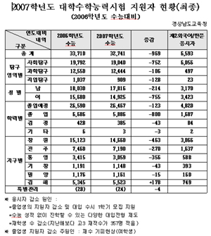 °æ»ó³²µµ±³À°Ã»¿¡¼´Â ¿À´Â 11¿ù 16ÀÏ ½Ç½ÃµÇ´Â 2007Çг⵵ ´ëÇмöÇдɷ½ÃÇè ÀÀ½Ã¿ø¼ Á¢¼ö °á°ú µµ³»¿¡¼´Â Àü³âµµ ´ëÇмöÇдɷ½ÃÇè º¸´Ù 969¸íÀÌ ÁÙ¾îµç 3¸¸2õ741¸íÀÌ Áö¿øÇÑ °ÍÀ¸·Î Áý°èµÆ´Ù.
