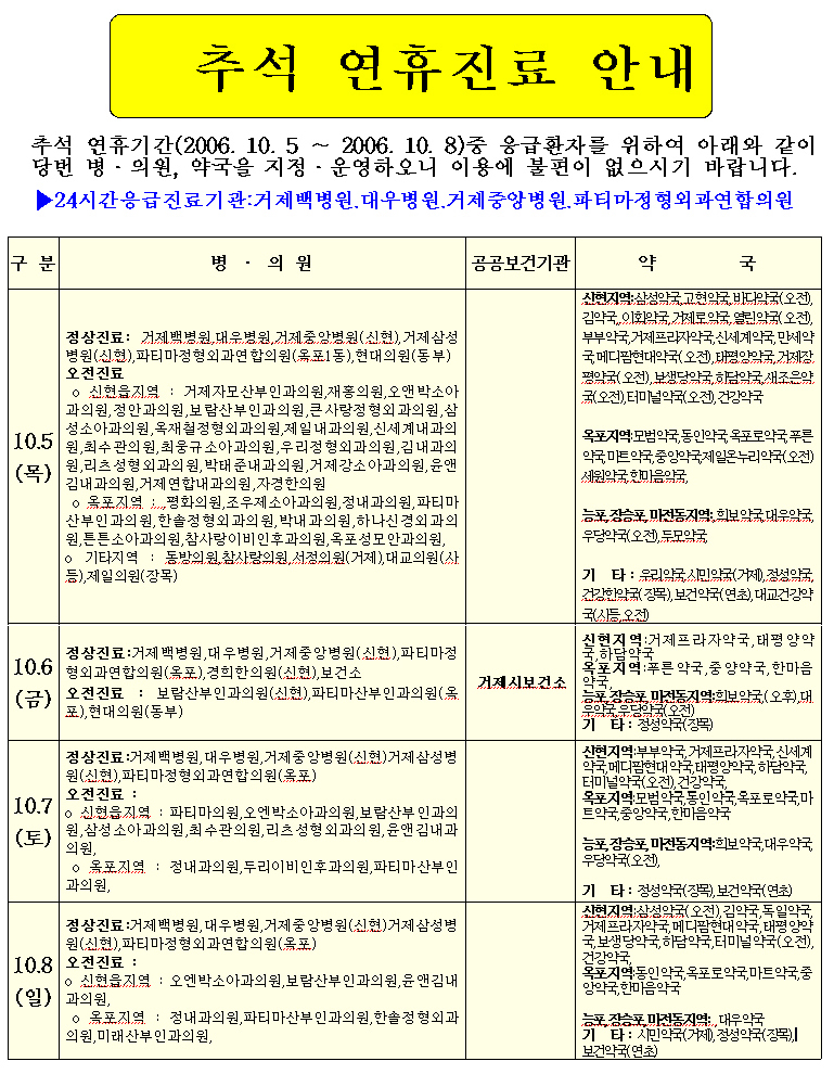 °ÅÁ¦½Ã º¸°Ç¼Ò(639-3800) ´ë¿ìº´¿ø(680-8114) °ÅÁ¦¹éº´¿ø(635-2187) 1339ÀÀ±ÞÀÇ·áÁ¤º¸¼¾ÅÍ