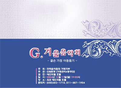 °ÅÁ¦ À¯ÀÏÀÇ ½Ç³»¾Ç´ÜÀÎ G Ä⸣ÅÝ(°ÅÁ¦Çö¾Ç 4ÁßÁÖ) ¿¬ÁÖȸ°¡ Çѱ¹À½¾ÇÇùȸ °ÅÁ¦ÁöºÎ ÁÖÃÖ·Î ¿À´Â 12¿ù 11ÀÏ ¿ÀÈÄ7½Ã ¿¡µå¹Ì·² È£ÅÚ¿¡¼ ¿¸°´Ù.