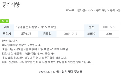 ¸íÁö´ë ÁÖ»óÈ£ ´ë¿ÜÇù·ÂóÀåÀº ´çÃÊ °Ô½ÃÆÇ¿¡ ¿Ã·È´ø °øÁöÀÇ ±ÛÀ» '±è¿µ»ï Àü ´ëÅë·É ±â»ç '¿Àº¸' È®ÀÎ' À̶ó´Â Á¦¸ñÀ¸·Î ¹Ù²ã Çб³ ȨÆäÀÌÁö ¸ÞÀÎÈ¸é °øÁö»çÇ׿¡ ´Ù½Ã °Ô½ÃÇß´Ù.