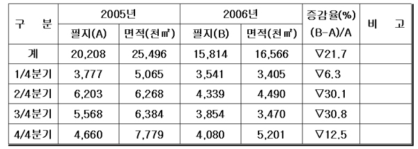 °ÅÁ¦½ÃÀÇ ÅäÁö°Å·¡ ÇöȲÀº 2005³â 2¸¸208ÇÊÁö¿¡¼ 2006³â 1¸¸5õ814ÇÊÁö·Î 4õ394°Ç(21.7%)ÀÌ °¨¼ÒÇß´Ù.