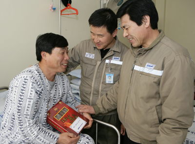 15ÀÏ ´ë¿ìÁ¶¼±Çؾç Á÷¿øµéÀÌ º´¿ø¿¡¼ ÀçȰġ·áÁßÀÎ µ¿·á¸¦ ¹æ¹®, °Ç°½ÄǰÀ» Àü´ÞÇÏ¸ç ºü¸¥ ȸº¹À» ±â¿øÇϰí ÀÖ´Ù.