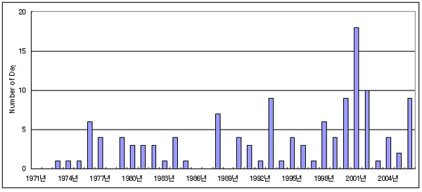 Áö³ 1971³âºÎÅÍ 2000³â±îÁö ¿¬Æò±Õ 2.8ÀÏ¿¡ ºÒ°úÇÏ´ø Ȳ»çÀϼö°¡ 1998³â 4¿ù°ú 2001³â 3~4¿ù¿¡´Â 4Àϵ¿¾È Áö¼ÓµÇ´Â µî Ȳ»ç´Â º½Ã¶ ¿ì¸®³ª¶ó¸¦ ã¾Æ¿À´Â ¿¹ÃøÇϱâ Èûµç ºÒû°´ÀÌ µÇ°í ÀÖ´Ù.