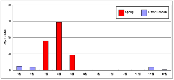 Ȳ»ç°üÃøÀÌ ½ÃÀÛµÈ Áö³ 35³â Áß, °ÅÁ¦ µî °æ³²¼ºÎ³²ÇؾÈÁö¹æÀº 1990³â´ë ÈĹݺÎÅÍ ÀæÀº Ȳ»çÇö»óÀÌ °üÃøµÇ±â ½ÃÀÛÇßÀ¸¸ç, º½Ã¶ÀÌ ¾Æ´Ñ °¡À»°ú °Ü¿ï¿¡µµ °üÃøµÆÀ¸³ª, 89% ÀÌ»óÀÌ º½Ã¶(3¿ù, 4¿ù, 5¿ù¼ø)¿¡ ÁýÁߵǴ °ÍÀ¸·Î ³ªÅ¸³µ´Ù.