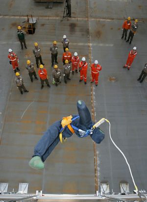 ±ØÀú¿ÂÀÎ ¿µÇÏ 163¡É¸¦ °ßµ®¾ß Çϴ ȹ°Ã¢ °ø»ç´Â LNG¿î¹Ý¼± °ÇÁ¶ÀÇ ÇÙ½É. ³»ºÎ¿¡ °ø»ç¸¦ À§ÇØ ¼³Ä¡ÇÑ È¹°Ã¢ ÀÛ¾÷¿ë ¹ßÆÇ ¼³Ä¡¿Í ÇØÃ¼´Â 10Ãþ ±Ô¸ðÀÇ °í¼ÒÀÛ¾÷ÀÌ´Ù. ¶§¹®¿¡ ȹ°Ã¢ ¹ßÆÇÀ» ¼³Ä¡Çϰųª ÇØÃ¼ÇÒ ¶§¸é ´Ã Ãß¶ô»ç°íÀÇ À§ÇèÀÌ ÀÖ¾ú´Ù.