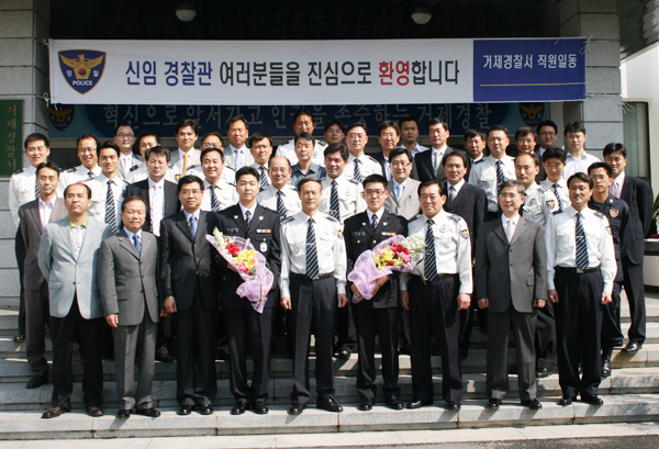 °ÅÁ¦°æÂû¼(¼Àå ¹Úµ¿½Å)´Â 7ÀÏ ¿ÀÀü °æÂû¼ Áß¾ÓÇö°ü ¾Õ¿¡¼ ¼Àå, °¢ °úÀå ±×¸®°í º»¼ Á÷¿ø 60¿©¸íÀÌ Âü¼®ÇÑ °¡¿îµ¥ °ÅÁ¦°æÂû¼ °¡Á·ÀÌ µÈ ½ÅÀÓ°æÂû°ü 2¸í¿¡ ´ëÇÑ È¯¿µÇà»ç¸¦ °¡Á³´Ù.