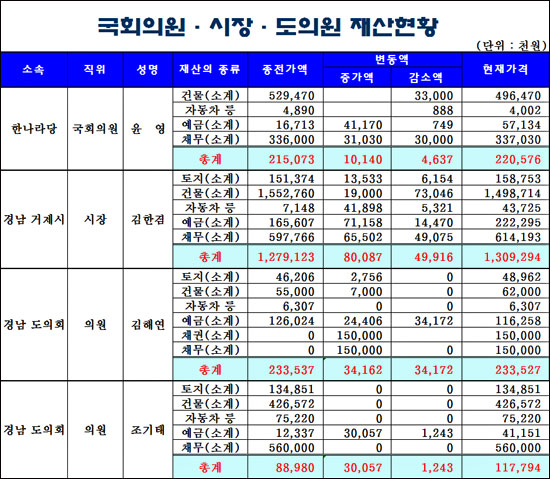 Àç»ê°ø°³´ë»óÀÎ °ÅÁ¦Áö¿ª ±¹È¸ÀÇ¿ø ½ÃÀå µµÀÇ¿ø ½ÃÀÇ¿ø 17¸í °¡¿îµ¥ 11¸íÀÇ Àç»êÀÌ ´Ã¾ú°í, 6¸íÀº ÁÙ¾ú´Ù.