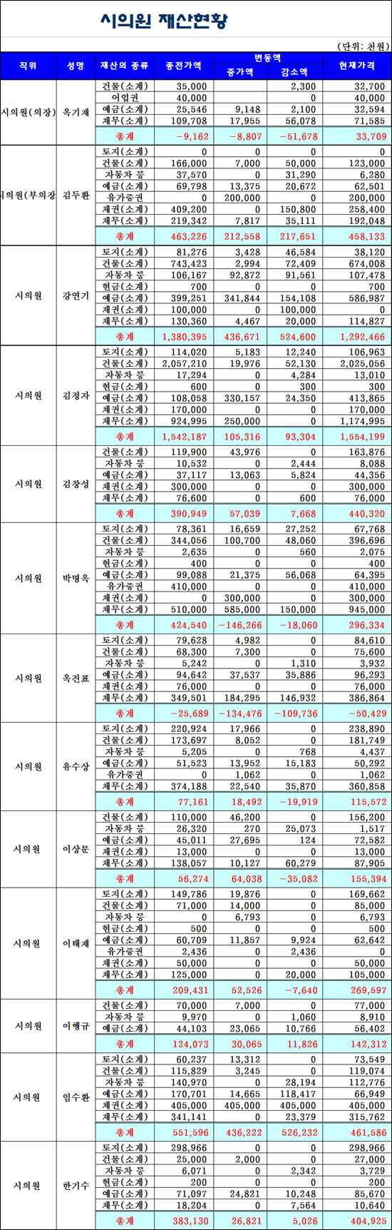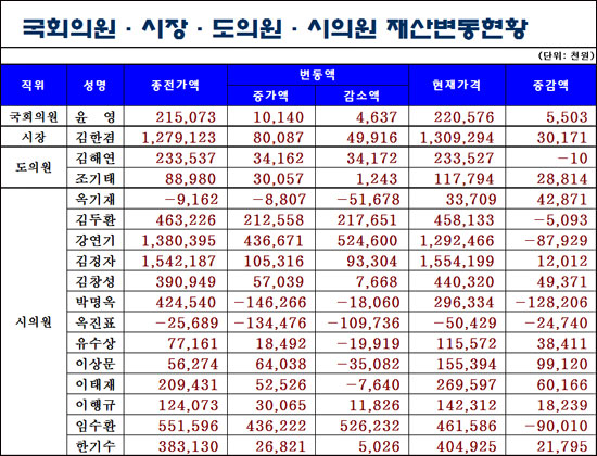 °¡Àå ºÎÀÚÀÎ ÀÇ¿øÀº ±èÁ¤ÀÚ ½ÃÀÇ¿ø(ºñ·Ê´ëÇ¥.Çѳª¶ó´ç)À¸·Î 15¾ï5419¸¸¿øÀ¸·Î ³ªÅ¸³µÀ¸¸ç ¿ÁÁøÇ¥ÀÇ¿øÀÌ -5042¸¸¿øÀ¸·Î Àç»êÀÌ °¡Àå ÀûÀº ÀÇ¿øÀÌ µÆ´Ù. ±èÇѰ⠰ÅÁ¦½ÃÀåÀº 13¾ï929¸¸¿øÀ¸·Î 2À§, °¿¬±â ½ÃÀÇ¿øÀÌ 12¾ï9246¸¸¿øÀ¸·Î 3À§¿¡ ¿Ã¶ú´Ù.