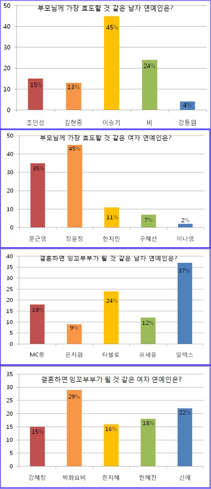 ¡®ºÎ¸ð´Ô²² °¡Àå È¿µµÇÒ °Í °°Àº ³²ÀÚ ¿¬¿¹ÀΡ¯À¸·Î´Â °¡¼ö °â ¿¬±âÀÚ À̽±Ⱑ 45%(438¸í)·Î 1À§¸¦ Â÷ÁöÇß´Ù. ±× µÚ·Î, °¡¼ö ºñ(Á¤ÁöÈÆ)°¡ 24%(232¸í)·Î 2À§¸¦ Â÷ÁöÇßÀ¸¸ç, Á¶Àμº 15%(144¸í), ±èÇöÁß 13%(124¸í), °µ¿¿ø 4%(40¸í) ¼øÀ¸·Î ³ªÅ¸³µ´Ù.