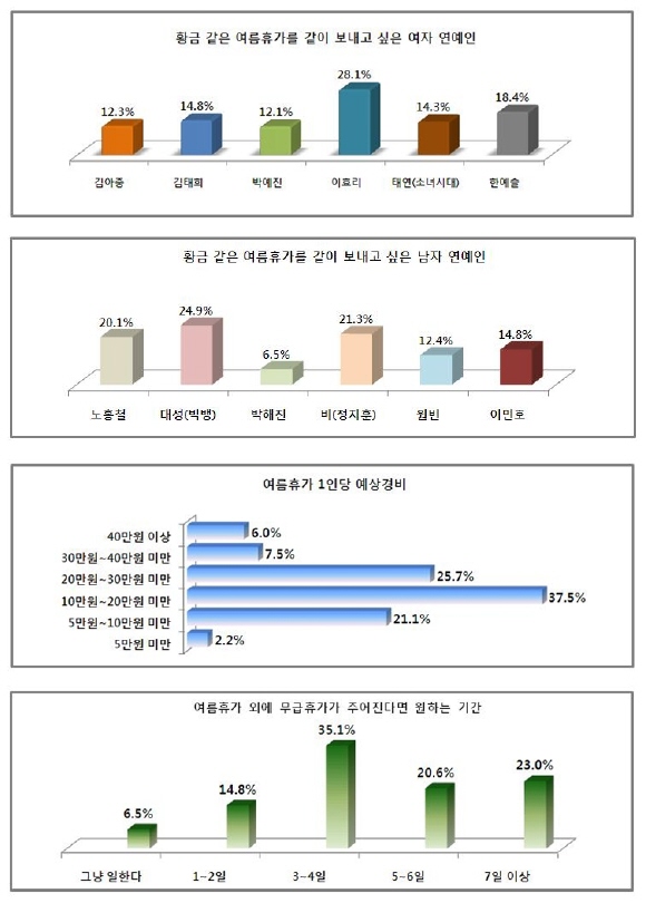 ¡®È²±Ý °°Àº ¿©¸§ÈÞ°¡¸¦ ÇÔ²² º¸³»°í ½ÍÀº ³²ÀÚ ¿¬¿¹ÀΡ¯À¸·Î´Â ºò¹ðÀÇ ¸â¹ö ´ë¼ºÀÌ 24.9%(206¸í)·Î 1À§¿¡ ¿Ã¶ú´Ù. °¡¼ö ºñ(Á¤ÁöÈÆ)´Â 21.3%(176¸í)·Î 2À§¸¦ Â÷ÁöÇß´Ù. ³ëȫöµµ 20.1%(166¸í)·Î ³ôÀº ÁöÁö¸¦ ¾ò¾úÀ¸¸ç, À̹ÎÈ£´Â 14.8%(122¸í), ¿øºó 12.4%(102¸í), ¹ÚÇØÁø 6.5%(54¸í) ¼øÀ̾ú´Ù.