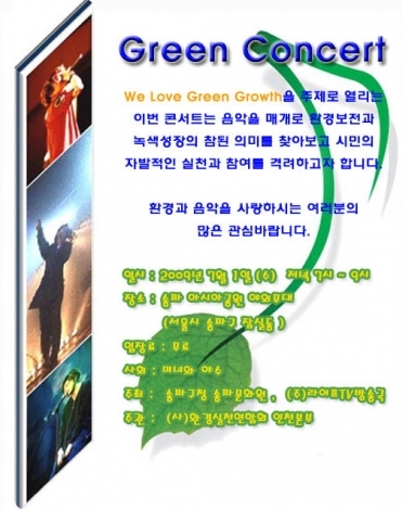 ¡®Green Concert¡¯´Â ȯ½Ç·Ã ÀÎõº»ºÎ(º»ºÎÀå °¼ºÈ£)ÀÇ ÁÖ°ü¾Æ·¡, ¼ÛÆÄ±¸Ã» ¼ÛÆÄ¹®È¿ø, (ÁÖ)¶óÀÌÇÁTV¹æ¼ÛÀÌ ÇÔ²²Çϸç, ¡°We Love Green Growth¡±¶ó´Â ÁÖÁ¦·Î À½¾ÇÀ» ¸Å°³·Î ȯ°æº¸Àü°ú ³ì»ö¼ºÀåÀÇ ÂüµÈ Àǹ̸¦ ã¾Æº¸°í ½Ã¹ÎÀÇ ÀÚ¹ßÀûÀÎ ½Çõ°ú Âü¿©¸¦ °Ý·ÁÇϴµ¥ ±× ¸ñÀûÀ» µÎ°í ÀÖ´Ù.
