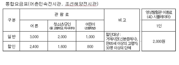 °ü¶÷·á´Â ¾î¸¥ 3000¿ø, û¼Ò³â ¹× ±ºÀÎ 2000¿ø, ¾î¸°ÀÌ 1000¿øÀ̸ç, Á¶¼±ÇؾçÀü½Ã°üÀÇ ¿µ»óŽÇè°üÀº ÷´ÜÁ¶¼±±â¼ú·Î ¸¸µç À§±×¼±À» Ÿ°í °ÅÁ¦µµÀÇ ÇØÀú¸¦ ŽÇèÇÏ´Â ±¹³» ÃÖ´ë ±Ô¸ðÀÇ 4D ½Ã¹Ä·¹ÀÌÅÍ ½Ã¼³·Î¼ º°µµ·Î 2000¿øÀÇ Ã¼Çè¿ä±ÝÀ» ¹Þ°Ô µÈ´Ù.