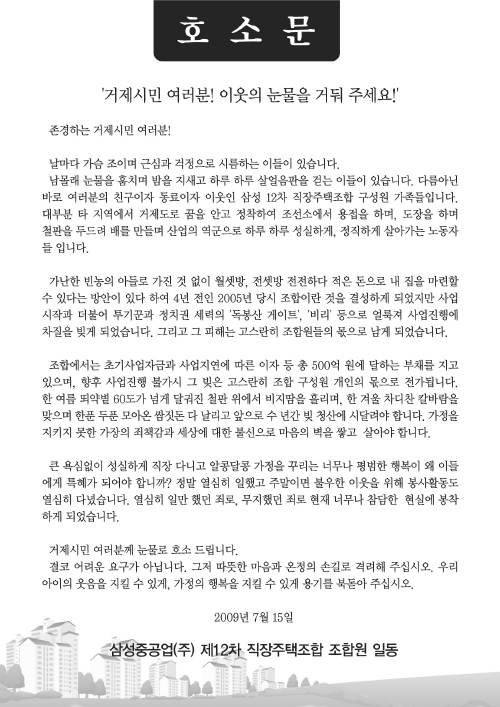 À̵éÀº '°ÅÁ¦½Ã¹Î ¿©·¯ºÐ ÀÌ¿ôÀÇ ´«¹°À» °ÅµÖ ÁÖ¼¼¿ä' ¶ó´Â Á¦¸ñÀÇ È£¼Ò¹®À» ½Ã¹Îµé¿¡°Ô ¹èÆ÷Çß´Ù.