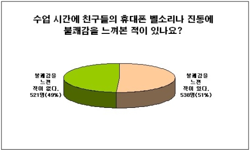 ¡°¼ö¾÷½Ã°£¿¡ Ä£±¸µéÀÇ ÈÞ´ëÀüÈ º§¼Ò¸®³ª Áøµ¿ ¼Ò¸®¿¡ ºÒÄè°¨À» ´À²¸º» ÀûÀÌ ÀÖ³ª¿ä?¡±¶ó´Â Áú¹®¿¡ ¡°ºÒÄè°¨À» ´À²¸º» ÀûÀÌ ÀÖ´Ù.¡±°¡ ÃÑ ´äº¯ÀÚ 1,059¸í Áß 538¸íÀ¸·Î 51%¿¡ ´ÞÇß°í ¡°ºÒÄè°¨À» ´À²¸º» ÀûÀÌ ¾ø´Ù.¡±´Â 521¸íÀ¸·Î 49%¿¡ ´ÞÇß´Ù. ÀÌ·Î º¸¾Æ Àý¹ÝÀÌ ³Ñ´Â ÇлýµéÀÌ ¼ö¾÷½Ã°£¿¡ ÈÞ´ëÀüÈ·Î ÀÎÇØ ½ºÆ®·¹½º¸¦ ¹Þ°í ÀÖ´Â °ÍÀ¸·Î º¸ÀδÙ.