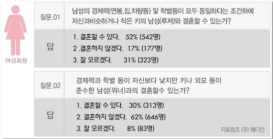 ¸ÕÀú, ¡®³²¼ºÀÇ °æÁ¦·Â(¿¬ºÀ) ¹× Çйú µîÀÌ ¸ðµÎ µ¿ÀÏÇÏ´Ù´Â Á¶°ÇÇÏ¿¡ ÀڽŰú ºñ½ÁÇϰųª ÀÛÀº ŰÀÇ ³²¼º (·çÀú)¿Í °áÈ¥ÇÒ ¼ö Àִ°¡?¡¯¸¦ ¹¯´Â Áú¹®¿¡´Â ¡®°áÈ¥ÇÒ ¼ö ÀÖ´Ù.¡¯ 52%(542¸í), ¡®°áÈ¥ÇÏÁö ¾Ê°Ú´Ù.¡¯ 17%(177¸í), ¡®Àß ¸ð¸£°Ú´Ù.¡¯ 31%(323¸í) ¼øÀ¸·Î ÀÀ´äÇÏ¿© Àý¹ÝÀÌ ³Ñ´Â ¿©¼ºÀÌ °áÈ¥°áÁ¤¿¡ ³²¼ºÀÇ Å°´Â Å« ¹®Á¦°¡ µÇÁö ¾Ê´Â °ÍÀ¸·Î ³ªÅ¸³µ´Ù.