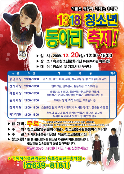 °ÅÁ¦½Ã½Ã¼³°ü¸®°ø´Ü(ÀÌ»çÀå ¿ø¿ë±Ô) ¿ÁÆ÷û¼Ò³â¹®ÈÀÇÁý¿¡¼´Â 2009³â ÇÑ ÇØ¸¦ ¸¶¹«¸®ÇÏ¸é¼ ¿À´Â 20ÀÏ(ÀÏ) 12½ÃºÎÅÍ ¿ÀÈÄ 3½Ã±îÁö ¿ÁÆ÷û¼Ò³â¹®ÈÀÇÁý¿¡¼ û¼Ò³â ¹× °¡Á·, ½Ã¹ÎµéÀÌ Âü¿©ÇÏ´Â ¡°1318 û¼Ò³âµ¿¾Æ¸®ÃàÁ¦¡±¸¦ °³ÃÖÇÑ´Ù.