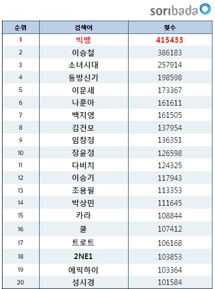 °Ë»ö 100À§ ±ÇÀ» »ìÆìº¸¸é ¿Ã ÇØ ³²ÀÚ ¼Ö·Î °¡¼öµéÀÌ 33%¸¦ Â÷ÁöÇÑ µ¥ ÀÌ¾î ¿©¼º ¼Ö·Î¿Í ³²ÀÚ±×·ì ¼øÀ¸·Î Â÷ÁöÇß´Ù. ¹Ý¸é ¼Ò³à½Ã´ë¿Í Ä«¶ó, 2ne1 µîÀÌ ¼Ò¼öÀÇ °É±×·ìµéÀÌ ¼øÀ§¿¡ ¿Ã¶ó ¿ÃÇØ ´Â °É±×·ì ´ë¼¼¶ó´Â ¸»À» ¹«»öÇÏ°Ô Çß´Ù.