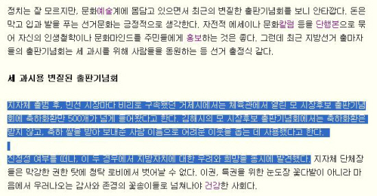 Á¤Ä¡´Â Àß ¸ð¸£Áö¸¸, ¹®È¿¹¼ú°è¿¡ ¸ö´ã°í ÀÖÀ¸¸é¼ ÃÖ±ÙÀÇ º¯ÁúÇÑ ÃâÆÇ±â³äȸ¸¦ º¸´Ï ¾ÈŸ±õ´Ù. µ·Àº ¸·°í ÀÔ°ú ¹ßÀ» Ǫ´Â ¼±°Å¹®È´Â ±àÁ¤ÀûÀ¸·Î »ý°¢ÇÑ´Ù. ÀÚÀüÀû ¿¡¼¼À̳ª ¹®ÈÄ®·³ µîÀ» ´ÜÇົÀ¸·Î ¹¾î ÀÚ½ÅÀÇ ÀλýöÇÐÀ̳ª ¹®È¸¶Àε带 Áֹε鿡°Ô È«º¸ÇÏ´Â °ÍÀº ÁÁ´Ù. ±×·±µ¥ ÃÖ±Ù Áö¹æ¼±°Å Ã⸶ÀÚµéÀÇ ÃâÆÇ±â³äȸ´Â ¼¼ °ú½Ã¸¦ À§ÇØ »ç¶÷µéÀ» µ¿¿øÇÏ´Â µî ¼±°Å ÃâÁ¤½Ä °°´Ù.