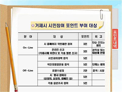 ¡®½Ã¹ÎÂü¿© Æ÷ÀÎÆ®Á¦¡¯´Â ½Ã¹ÎÀÌ ÇàÁ¤¿¡ Àû±ØÀûÀ¸·Î Âü¿©Çϵµ·Ï À¯µµÇϱâ À§ÇÑ Á¦µµ·Î½á ½Ã ȨÆäÀÌÁö¿¡ ±¹¹ÎÁ¦¾ÈÀ» ¿Ã¸®°Å³ª '°ÅÁ¦½Ã¿¡ ¹Ù¶õ´Ù' µî °¢Á¾ ºÒÆí½Å°í´Â 3000Æ÷ÀÎÆ®, ½Ã¹ÎÀÚÄ¡´ëÇÐ, ±¹Åä´ëû°á¿îµ¿, °øÃ»È¸ ¹× ¼³¸íȸ µî ½ÃÀÇ °¢Á¾Çà»ç Âü¿©¿¡´Â 5000 Æ÷ÀÎÆ®, ǥâ¼ö»óÀÚ´Â 2¸¸ Æ÷ÀÎÆ®°¡ ºÎ¿© µÈ´Ù.