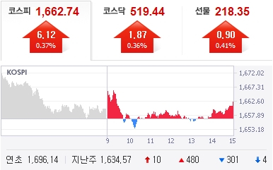 12ÀÏ ÄÚ½ºÇǰ¡ ¿Ü±¹Àΰú ÇÁ·Î±×·¥ÀÇ ¸Å¼ö¿¡ ÈûÀÔ¾î 1660¼±À» ȸº¹Çß´Ù. À̳¯ ÄÚ½ºÇÇÁö¼ö´Â ÀüÀÏ ´ëºñ 6.12Æ÷ÀÎÆ®(0.37%) ¿À¸¥ 1662.74¿¡ °Å·¡¸¦ ¸¶ÃÆ´Ù.