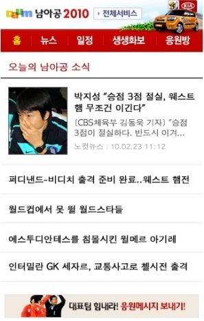 ´ëÇÑÃ౸Çùȸ(KFA) °ø½Ä ÈÄ¿ø»çÀÌÀÚ K-3¸®±× °ø½Ä ÈÄ¿ø»çÀÎ ´ÙÀ½Àº Áö³ 3ÀÏ ³²¾Æ°ø¿ùµåÄÅ D-100ÀÏÀ» ¸Â¾Æ '2010 ³²¾Æ°ø¿ùµåÄŠƯÁý À¥ÆäÀÌÁö'¸¦ ¿ÀÇÂÇѵ¥ ÀÌ¾î ¸ð¹ÙÀÏÀ¥¿¡¼µµ ³²¾Æ°ø Ưº° ÆäÀÌÁö¸¦ ¿ÀÇÂÇÔÀ¸·Î½á ÀÌ¿ëÀÚµéÀÌ ÈÞ´ëÆùÀ» ÅëÇØ Æí¸®ÇÏ°Ô ¿ùµåÄÅÀ» Áñ±æ ¼ö ÀÖµµ·Ï Çß´Ù.