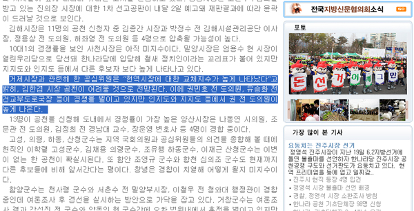ÃâóºÒ¸íÀÇ ±â»ç¸¦ ÀοëÇÑ ³×°ÅƼºê ¼±°ÅÀüÀ» ÆîÄ¡´Â Èĺ¸ÀÚµéÀÇ ÇâÇØ ±ä±Þº¸µµÀڷḦ ³Â´Ù. ÀÌ ¿¹ºñÈ帴 ¡°°æ³²ÀϺ¸°¡ ¹Ì È®ÀÎµÈ ÇÑ °ø½ÉÀ§¿øÀÇ ¹ß¾ðÀ» ÀüÁ¦·Î °ÅÁ¦½ÃÀå ¼±°Å °øÃµÇâ¹è¸¦ ¿¹´ÜÇß´Ù¡± ¸ç ¡°Ç×°£¿¡´Â ÀÌ ±â»ç¸¦ ¾Ç¿ëÇØ ¸ð Èĺ¸ Ãø ¿îµ¿¿øµéÀÌ Æ¯Á¤ ¿¹ºñÈĺ¸ 2¸í ¾ÐÃ༳, ÀÌ»ó¹® ¿¹ºñÈĺ¸ ½ÃÀÇ¿ø ÀÔÈĺ¸ ¼³ µî ºñ¿ÇÑ ³×°ÅƼºêÀüÀ» ÆîÄ¡°í ÀÖ´Ù. (ÀÚ½ÅÀº)ÀÌ·± ³×°ÅƼºê ÀüÀ» ÆîÄ¡´Â ¿¹ºñÈĺ¸µé¿¡°Ô Á¤Ä¡¸¦ Çϱâ Àü¿¡ Á¤Ä¡µµÀǺÎÅÍ ¹è¿ï °ÍÀ» ÁÖ¹®ÇÏ°í ½Í´Ù¡± °í Çß´Ù.