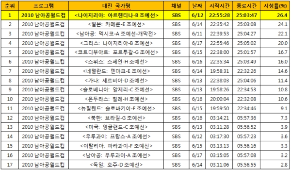 18ÀÏ ½Ãû·ü Á¶»ç±â°üÀÎ TNmS(´ëÇ¥: ¹Î°æ¼÷)ÀÇ Á¶»ç¿¡ ÀÇÇϸé, 2010³²¾Æ°ø ¿ùµåÄÅ °³¸·ºÎÅÍ 6¿ù 17ÀϱîÁö Áß°èµÈ °æ±â Áß Çѱ¹ Àü ÀÌ¿ÜÀÇ °æ±âµéÀ» ºÐ¼®ÇÑ °á°ú, 6¿ù12ÀÏ ¹æ¼ÛµÈ 2010 ³²¾Æ°ø ¿ùµåÄÅ <³ªÀÌÁö¸®¾Æ:¾Æ¸£ÇîÆ¼³ª>ÀÇ ½Ãû·üÀÌ 26.4%·Î °¡Àå ³ô¾Ò´Ù. (°¡±¸ Àü±¹ ±âÁØ)