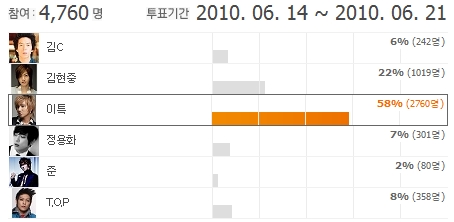 2À§´Â 22%ÀÇ µæÇ¥À²À» ¾òÀº SS501ÀÇ ¸®´õ ±èÇöÁßÀÌ Â÷ÁöÇß´Ù. ³×ƼÁðÀº ¡°2005³âºÎÅÍ Áö±Ý±îÁö ´Ü ÇÑ ¹øµµ ¹®Á¦¸¦ ÀÏÀ¸Å°Áö ¾Ê°í ÁÁÀº ÀϷθ¸ °¢Á¾ ´º½º¿¡ ¿À¸£³»·È´ø SS501ÀÇ ¸®´õ ±èÇöÁßÀÌ ÃÖ°íÀÎ °Í °°³×¿ä.¡±, ¡°¸â¹ö°£ ¿ìÁ¤µµ µ·µ¶Çغ¸À̰í, ÆÒµé°ú ¼ÒÅëÇÏ´Â ¸ð½À¿¡¼µµ ±èÇöÁßÀÌ µçµçÇÑ ¸ð½ÀÀ» º¸¿©ÁÖ´Â °Í °°¾Æ¿ä.¡±¶ó¸ç ÁöÁöÇß´Ù. ÇÑÆí, ±èÇöÁßÀÌ ¼ÓÇÑ SS501Àº Áö³ 5¿ù ¾Ù¹ü ¡®µ¥½ºÆ¼³×À̼ǡ¯(DESTINATION)À» ¹ß¸ÅÇϰí ŸÀÌÆ² °î ¡®·¯ºê ¾ß¡¯(LOVE YA)·Î Ȱµ¿ ÁßÀÌ´Ù. SS501ÀÇ ¡®·¯ºê ¾ß¡¯(LOVE YA)´Â ÇöÀç ¡®¹÷½º Â÷Æ® ÁÖ°£ Top100¡¯ 11À§¿¡ ¿Ã¶ó ÀÖ´Ù.