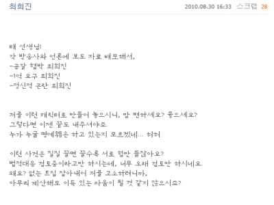 ÃÖÈñÁøÀº ¡°Å ¼±»ý´Ô! °¢ ¹æ¼Û»ç¿Í ¾ð·Ð¿¡ º¸µµ ÀÚ·á ¹èÆ÷ÇØ¼, -°ø°¥ Çù¹Ú ÃÖÈñÁø -1¾ï ¿ä±¸ ÃÖÈñÁø -Á¤½ÅÀû °ï¶õ ÃÖÈñÁø. Àú¸¦ ÀÌ·± ij¸¯ÅÍ·Î ¸¸µé¾î ³õÀ¸½Ã´Ï, ¸¾ ÆíÇϼ¼¿ä? ÁÁÀ¸¼¼¿ä? ±×·¸´Ù¸é ÀÌÁ¨ ³¡µµ ³»ÁּžßÁÒ. ´©°¡ ´©±¼ ¸í¿¹ÈÑ¼Õ Çϰí ÀÖ´ÂÁö ¸ð¸£°Ú³×... ÇãÇ㡱¶ó´Â ±Û·Î ½ÃÀÛÇß´Ù.