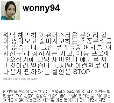 ÃÖ¿øÁ¤ ¾Æ³ª¿î¼, Á¶¿µ³² ¾Æ³ª¿î¼ ¿©Ä£ ¹ß¾ð¿¡ "¾Æ³ª¿î¼ ÆïÇÏ Stop!"