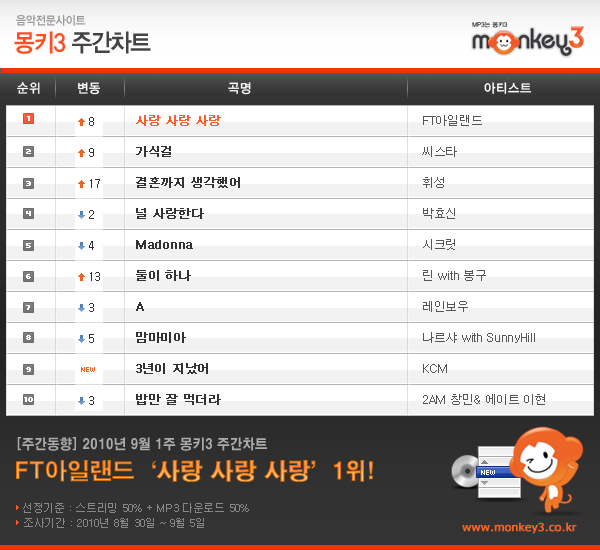 À½¾ÇÀü¹®»çÀÌÆ® ¸ùŰ 3 9¿ù 1ÁÖ(8¿ù 30ÀÏ~9¿ù 5ÀÏ) ÁÖ°£Â÷Æ®¿¡¼ FT ¾ÆÀÏ·£µåÀÇ ¡®»ç¶û »ç¶û »ç¶û¡®ÀÌ Á¤»óÀ» Â÷ÁöÇß´Ù. ¸ùŰ 3 ÁÖ°£Â÷Æ® 1À§¿¡ ¿À¸¥µ¥ À̾î SBS ÀαⰡ¿ä '¹ÂƼÁð ¼Û'À» Â÷ÁöÇϸç ÀÎ±â °í°øÇàÁøÀ» ´Þ¸®°í ÀÖ´Ù. ½ÃÅ©¸´ÀÇ 2ÁÖ°£ 1À§ ÁúÁÖ´Â ft¾ÆÀÏ·£µåÀÇ ¡®»ç¶û »ç¶û »ç¶û¡¯À¸·Î Á¦Áö´çÇß´Ù.