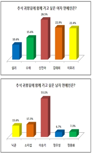 ¡®Ãß¼® ±ÍÇâ±æ¿¡ ÇÔ²² °¡°í ½ÍÀº ¿©ÀÚ ¿¬¿¹ÀΡ¯À¸·Î´Â ½Å¹Î¾Æ°¡ 28.5%(306¸í)¸¦ ¾ò¾î 1À§¸¦ ±â·ÏÇß´Ù. ¿µÈ ¡®±×¶ûÇÁ¸®¡¯·Î µ¹¾Æ¿Â ¹è¿ì ±èÅÂÈñ´Â 22.9%(246¸í)·Î µÚ¸¦ À̾úÀ¸¸ç, Áö³ÇØ 1À§¸¦ Â÷ÁöÇß´ø °¡¼ö ÀÌÈ¿¸®´Â 22.4%(240¸í)¸¦ Â÷ÁöÇß´Ù. ¹è¿ì ¼ö¾Ö´Â 15.6%(168¸í), ¿¡ÇÁ¿¢½ºÀÇ ¼³¸® 10.6%(114¸í) À̾ú´Ù.