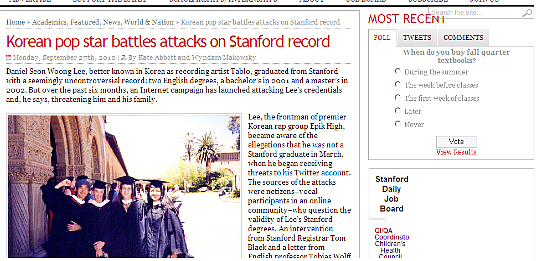 ½ºÅÄÆÛµå´ë ±³³»½Å¹®ÀÎ ¡®½ºÅÄÆÛµå µ¥Àϸ®(The Stanford Daily)¡¯´Â 27ÀÏ(ÇöÁö½Ã°£)ÀÚ ÀÎÅÍ³ÝÆÇ ±â»ç¿¡¼ ¡®Çѱ¹ ÆË ½ºÅ¸ ½ºÅÄÆ÷µå ÀÌ·Â ³í¶õ(Korean pop star battles attacks on Stanford record)¡¯À̶õ Á¦¸ñÀ¸·Î Ÿºí·ÎÀÇ Çз ³í¶õÀ» ´Ù·ð´Ù. 2002³â Ÿºí·ÎÀÇ Á¹¾÷½Ä »çÁøµµ ÇÔ²² °ÔÀçÇß´Ù.