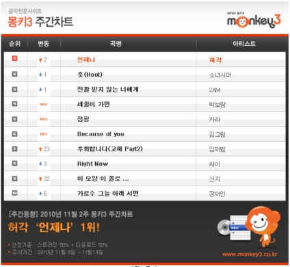 À½¾ÇÀü¹®»çÀÌÆ® ¸ùŰ3 11¿ù 2ÁÖ(11¿ù8ÀÏ~14ÀÏ) ÁÖ°£Â÷Æ®¿¡¼ Çã°¢ÀÇ ¡®¾ðÁ¦³ª¡¯°¡ 1À§¿¡ ¿Ã¶ú´Ù. Çã°¢ÀÇ ¡®¾ðÁ¦³ª¡¯´Â ÁÖ°£Â÷Æ® ÁøÀÔ 2ÁÖ ¸¸¿¡ 1À§¿¡ ¿Ã¶ó °è¼ÓµÇ´Â ¡®½´ÆÛ½ºÅ¸K2¡¯ ¿±â¸¦ ÀÔÁõÇß´Ù.