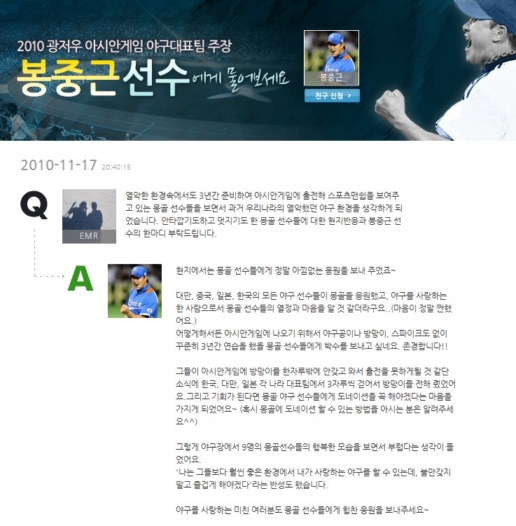 ºÀÁß±Ù ¼±¼ö°¡ ¹ÌÅõµ¥ÀÌ¿¡¼ ÁøÇàÇϰí ÀÖ´Â ¡®ºÀÁß±Ù ¼±¼ö¿¡°Ô ¹°¾îº¸¼¼¿ä¡¯Äڳʸ¦ ÅëÇØ ±¤Àú¿ì ¾Æ½Ã¾È °ÔÀÓ Çѱ¹ ¾ß±¸ ´ëÇ¥ÆÀ¿¡ ´ëÇÑ ¹ÌÅõµ¥ÀÌ Ä£±¸(¹ÌÄ£)µéÀÇ ±Ã±ÝÁõÀ» ½Ã¿øÇÏ°Ô Ç®¾îÁÖ°í ÀÖ´Ù.