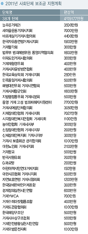 1000¸¸¿ø ÀÌ»ó º¸Á¶±ÝÀ» ¹Þ´Â »óÀ§ 11°³ ´Üü´Â ÁöüÀå¾ÖÀÎÇùȸ, »õ¸¶À»¿îµ¿°ÅÁ¦½ÃÁöȸ, ¹Ù¸£°Ô»ì±â °ÅÁ¦½ÃÇùÀÇȸ, ´ÃǪ¸¥°ÅÁ¦21, °ÅÁ¦½Ã¿©¼º´ÜüÇùÀÇȸ, ¹üÁËÇÇÇØÀÚÁö¿ø¼¾ÅÍ, ´ëÇѳëÀÎȸ °ÅÁ¦½ÃÁöȸ, ÀÚÀ¯ÃÑ¿¬¸Í °ÅÁ¦½ÃÁöȸ, ¹üÁË¿¹¹æÀ§¿ø ÇùÀÇȸ, ÀçÇⱺÀÎȸ, ÀÚ¿¬º¸È£¿¬¸Í°ÅÁ¦½ÃÇùÀÇȸ ¼øÀÌ´Ù.