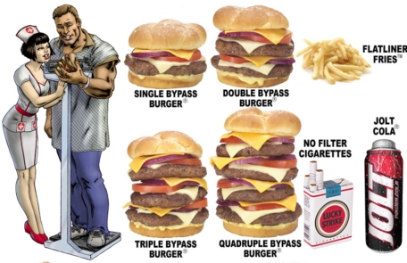 ¹Ì±¹ ¾Ö¸®Á¶³ªÀÇ ¿Ü½Ä¾÷ü '½ÉÀ帶ºñ ±×¸±'(Heart Attack Grill)Àº "350ÆÄ¿îµå(158kg)°¡ ³Ñ´Â ºñ¸¸ÀÎ »ç¶÷µé¿¡°Õ ¸ðµç À½½ÄÀ» °øÂ¥·Î ÁÖ°Ú´Ù"´Â ÀÌ»öÈ«º¸¸¦ ÆîÃÄ ´«±æÀ» ²ø¾ú´Ù.
