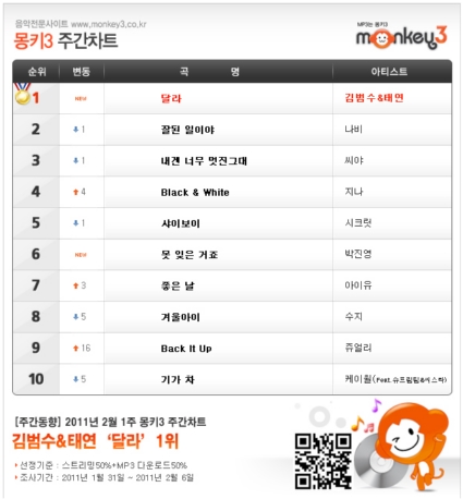 À½¾ÇÀü¹®»çÀÌÆ® ¸ùŰ3°¡ ¹ßÇ¥ÇÑ 2¿ù 1ÁÖ(1¿ù 31ÀÏ~2¿ù 6ÀÏ) ÁÖ°£Â÷Æ® 1À§´Â ±è¹ü¼ö¿Í ¼Ò³à½Ã´ë Å¿¬ÀÇ µà¿§°î ¡®´Þ¶ó¡¯°¡ Â÷ÁöÇß´Ù.