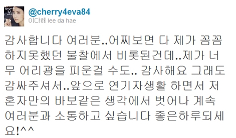 ÀÌ´ÙÇØ´Â 2ÀÏ ÀÚ½ÅÀÇ Æ®À§ÅÍ¿¡ ¡°²Ä²ÄÇÏÁö ¸øÇß´ø ÀúÀÇ ºÒÂû¿¡¼ ºñ·ÔµÈ °Çµ¥ °¨½ÎÁּż °¨»çÇÏ´Ù¡±¸ç ¡°¾ÕÀ¸·Î ¿¬±âÀÚ »ýȰ ÇÏ¸é¼ Àú È¥ÀÚ¸¸ÀÇ ¹Ùº¸ °°Àº »ý°¢¿¡¼ ¹þ¾î³ª °è¼Ó ¿©·¯ºÐ°ú ¼ÒÅëÇÏ°í ½Í´Ù¡±°í ÆÒµé¿¡ ´ëÇÑ °¨»çÇÑ ¸¶À½À» ÀüÇß´Ù.