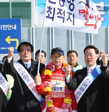 µ¿³²±Ç ½Å°øÇ× ¹Ð¾çÀ¯Ä¡¸¦ À§ÇØ 1000km Àü±¹ ¼øÈ¸ ´Þ¸®±â¿¡ ³ª¼± ¼¿¹°¡ ÇÑÆÇ¼®¾¾(57¼¼, ¹Ð¾ç½Ã »ï¹®µ¿)°¡ Àü±¹ ¼øÈ¸¸¦ ¸¶Ä¡°í 2ÀÏ ¿ÀÀü 10½Ã30ºÐ °æ³² µµÃ»¾Õ ±¤Àå¿¡ µµÂøÇß´Ù.