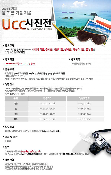 ¡®2011 °ÅÁ¦ º½/¿©¸§/°¡À»/°Ü¿ï UCC »çÁøÀü¡¯Àº ÇöÀç º½ Á¢¼ö°¡ ÁøÇà ÁßÀ̸ç, °ÅÁ¦ÀÇ ¾î´À °÷À̵ç ÃÔ¿µµÈ »çÁøÀ» ȨÆäÀÌÁö(http://visit.geoje.go.kr)¿¡ ¿Ã¸®¸é µÈ´Ù. ÀÀ¸ðÀÚ¿¡°Ô´Â ¼ÒÁ¤ÀÇ °ÅÁ¦»ç¶û »óǰ±Ç ¶Ç´Â Áö¿ªÆ¯»ê¹°ÀÌ ÁÖ¾îÁø´Ù.