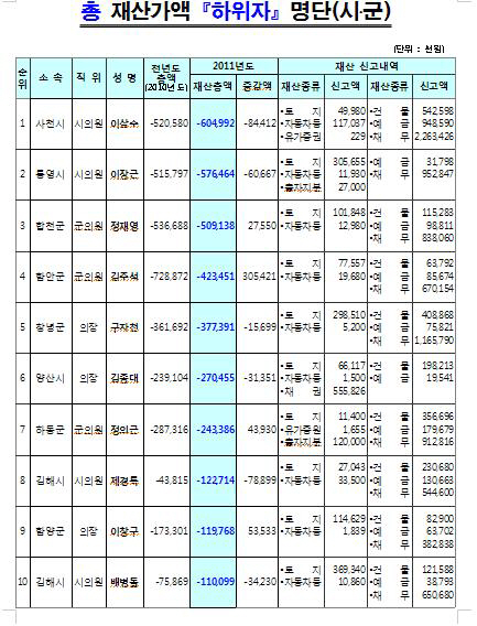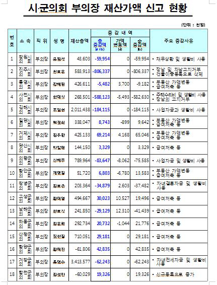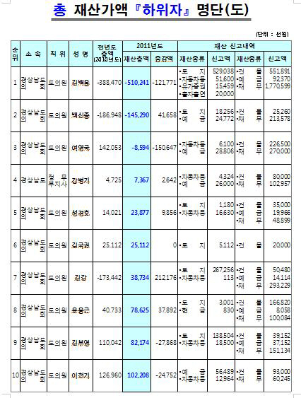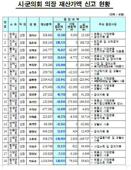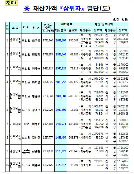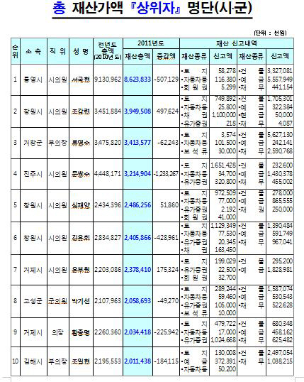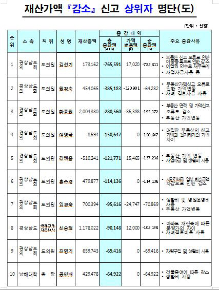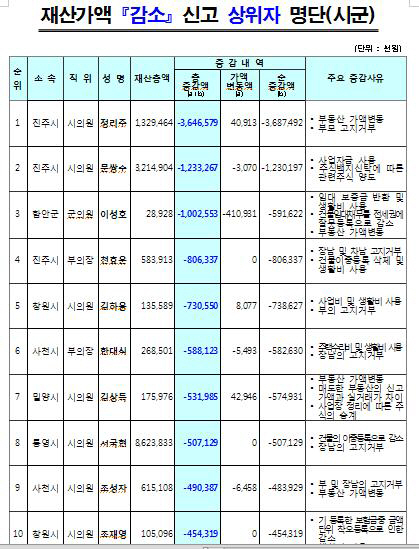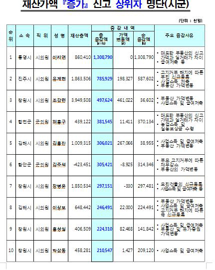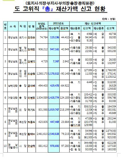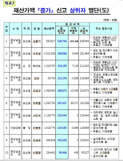 °æ»ó³²µµ°øÁ÷ÀÚÀ±¸®À§¿øÈ¸(°æ³²°³¹ß°ø»ç»çÀå, ½Ã±ºÀÇȸÀÇ¿ø)¿¡¼ °ø°³ÇÑ ´ë»óÀÚÀÇ °æ¿ì ÃÑ 258¸í Áß Àç»êÀÌ Áõ°¡ÇÑ °øÁ÷ÀÚ°¡ 137¸í(1¾ï¿ø ÀÌ»ó Áõ°¡ÀÚ 25¸í)À̸ç, Àç»êÀÌ °¨¼ÒÇÑ °øÁ÷ÀÚ°¡ 121¸í(1¾ï¿ø ÀÌ»ó °¨¼ÒÀÚ 32¸í)À¸·Î Æò±Õ ÃÑ Àç»ê¾×Àº ¾à 4¾ï7000¸¸¿øÀÎ °ÍÀ¸·Î ³ªÅ¸³µ´Ù.
