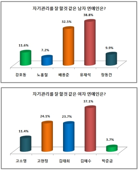 ¡®ÀÚ±â°ü¸®¸¦ Àß ÇÒ °Í °°Àº ³²ÀÚ ¿¬¿¹ÀΡ¯À¸·Î´Â À¯Àç¼®ÀÌ 38.8%(374¸í)¸¦ ¾ò¾î 1À§¸¦ ±â·ÏÇß°í, ÃÖ±Ù ¡®Åë Å«¡¯ ¼±ÇàÀ» ÆîÄ£ ¹è¿ëÁØÀº 32.5%(313¸í)·Î µÚ¸¦ À̾ú´Ù. °È£µ¿Àº 11.6%(112¸í), À嵿°Ç 9.9%(95¸í), ³ëȫöÀº 7.2%(69¸í) ¼øÀ̾ú´Ù.