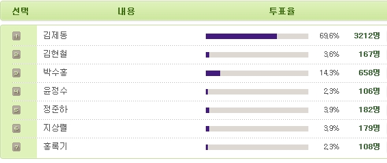 2À§´Â ¹Ú¼öÈ« 14.3%(658¸í), 3À§ Á¤ÁØÇÏ 3.9%(182¸í), 4À§ Áö»ó·Ä 3.9%(179¸í), 5À§ ±èÇöö 3.6%(167¸í), 6À§ È«·Ï±â 2.3%(108¸í), 7À§ À±Á¤¼ö 2.3%(108¸í) ¼øÀ̾ú´Ù.