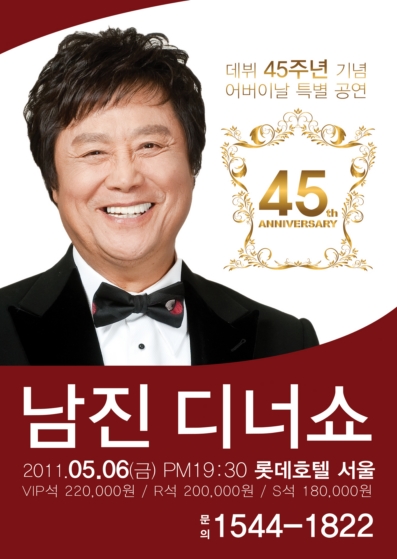 ³²ÁøÀº 45³â ¼¼¿ùÀÇ ¹«´ë ³ëÇϿ츦 À̹ø 'µ¥ºß 45Áֳ⠱â³ä Ưº° µð³Ê¼î'¸¦ ÅëÇØ ³»»Õ´Â´Ù. 45³âÀ» À̾߱â ÇØÁÙ È·ÁÇÑ ¹«´ë¿Í 20ÀÎÁ¶°¡ ³Ñ´Â ±¹³» ÃÖ°íÀÇ ¿ÀÄɽºÆ®¶ó ¹êµå, ÀÌ¿¡ ³²Áø¸¸ÀÇ È·ÁÇÑ ÀÔ´ã°ú ¹¶Å¬ÇÑ °¨µ¿±îÁö ³²ÁøÀÇ À̹ø ¡®45Áֳ⠱â³ä Ưº° µð³Ê¼î¡¯´Â ¾î´À Çϳª ºÎÁ·ÇÔÀÌ ¾ø´Ù.